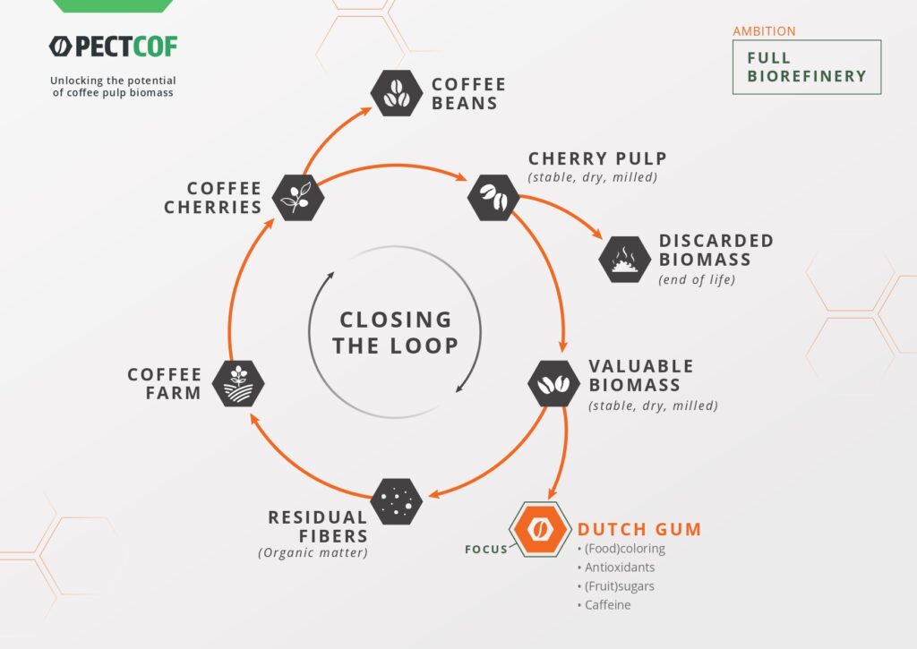 PectCof is the producer of “Dutch Gum®,” a food emulsifier and stabilizer made from pectin and proteins extracted from coffee pulp. The concept for PectCof originated in 2011 at Wageningen University in the Netherlands, where Rudi Dieleman and three other students proposed using coffee pulp as a functional food ingredient during a competition. Their innovative idea won the competition, earning them a loan from the business incubator StartLife, which enabled them to establish PectCof in 2012.