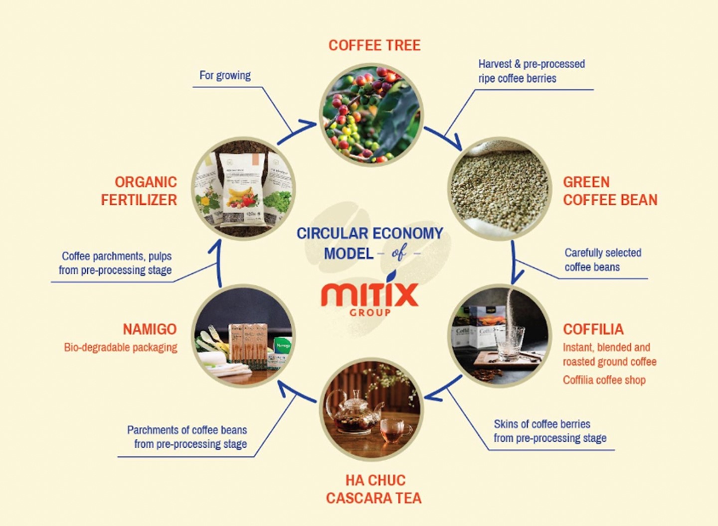 To tackle the growing crisis of resource scarcity and pollution, Mitix Group stands at the forefront, pioneering the integration of the Circular Economy Model into the production and processing of Vietnamese coffee.